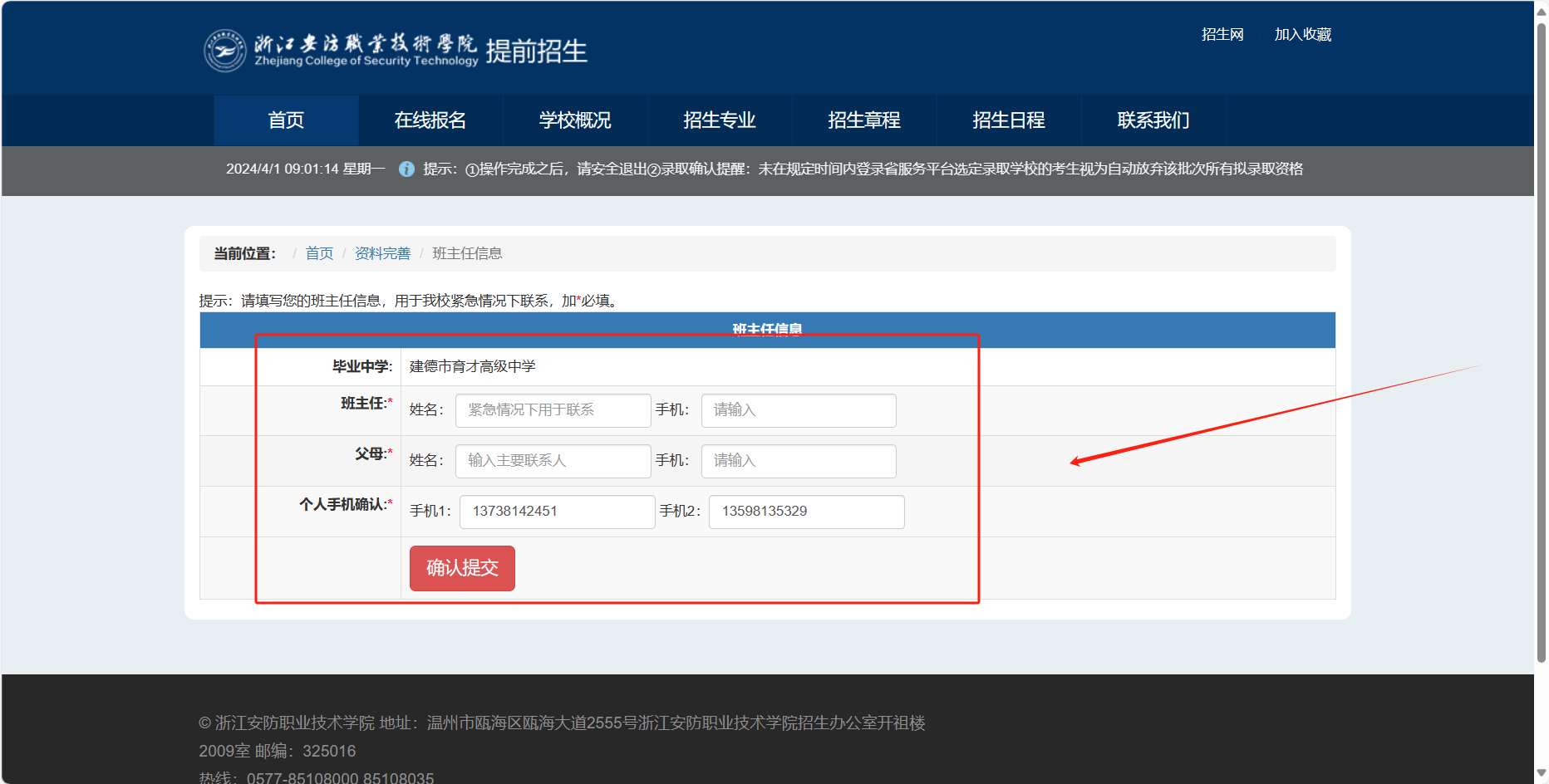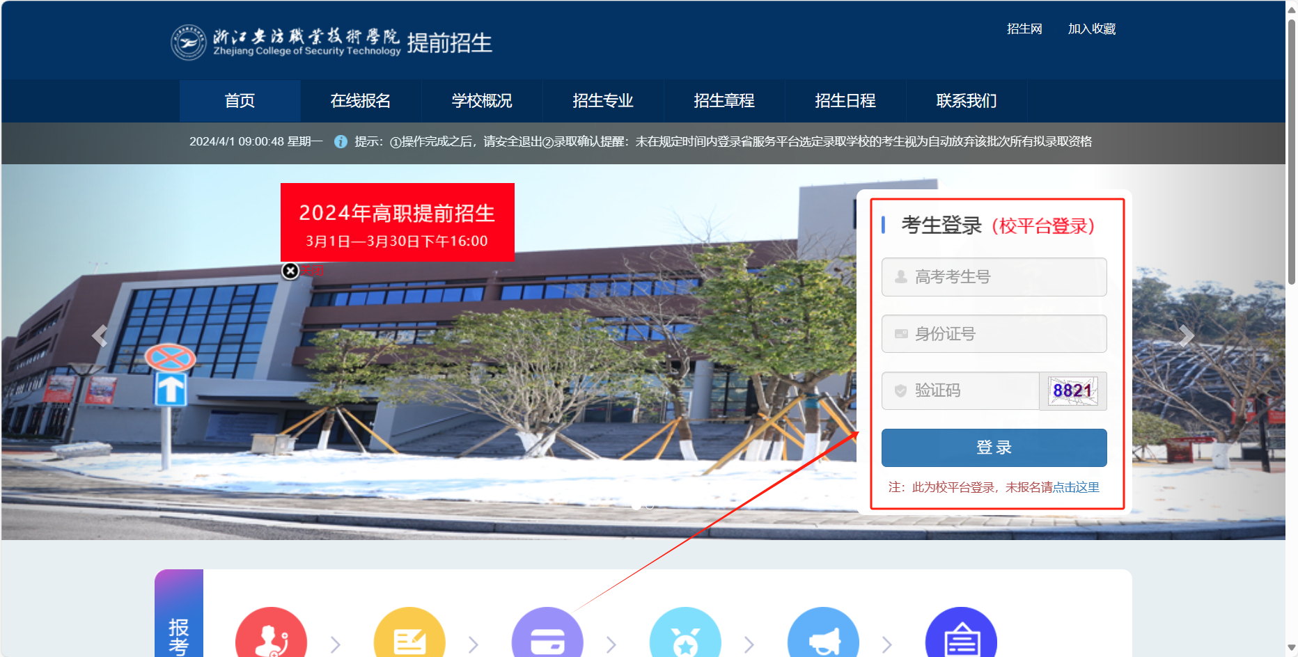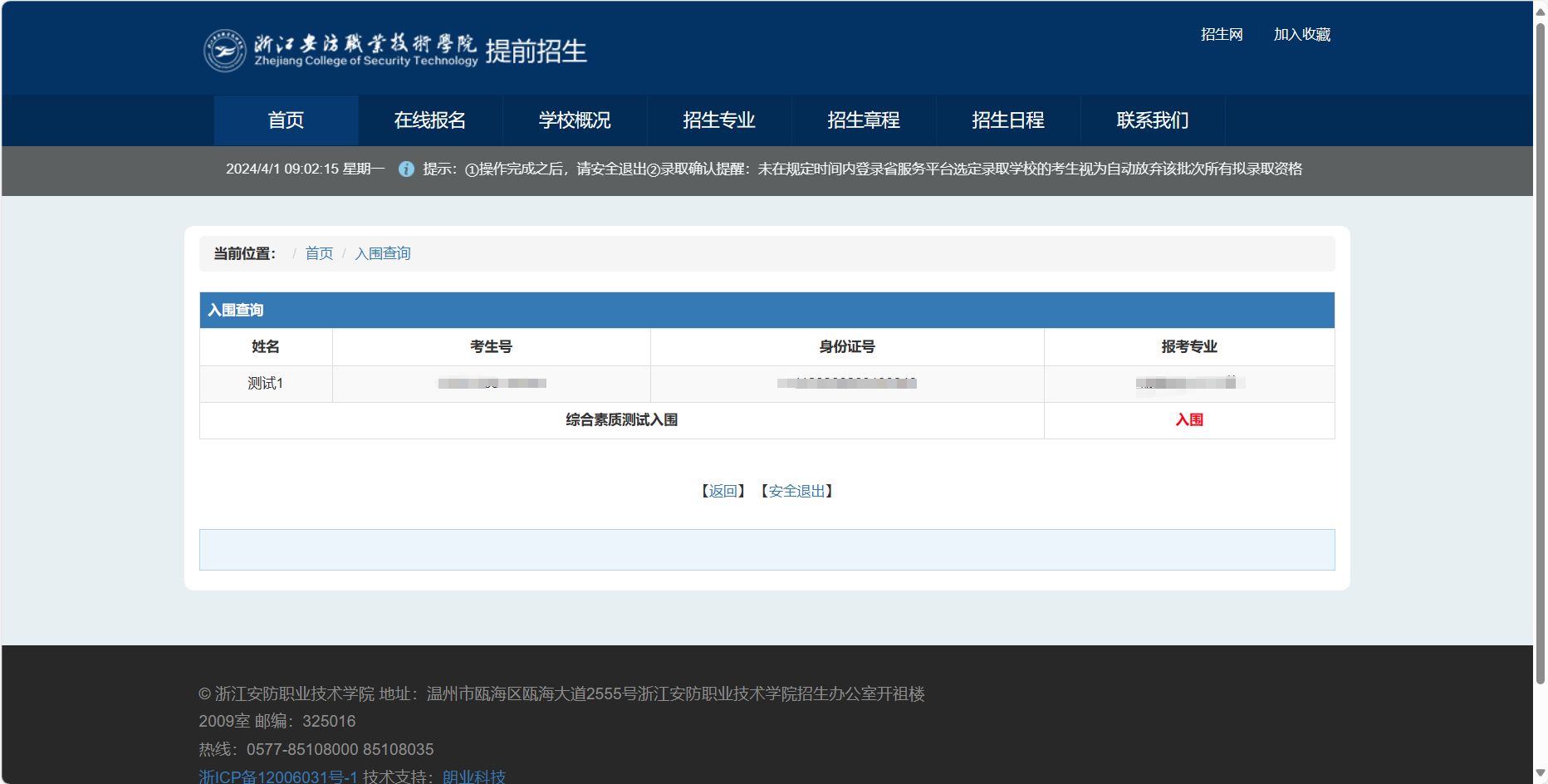 考生可于2024年4月1日16:00登录我校招生网(https://zs.zjcst.edu.cn/)查询,也可前往学校官网(https://www.zjcst.edu.cn/)点击浮窗链接,或关注浙江安防职业技术学院招生办微信公众号-报考指南-提前招生网,具体查询方法如下: