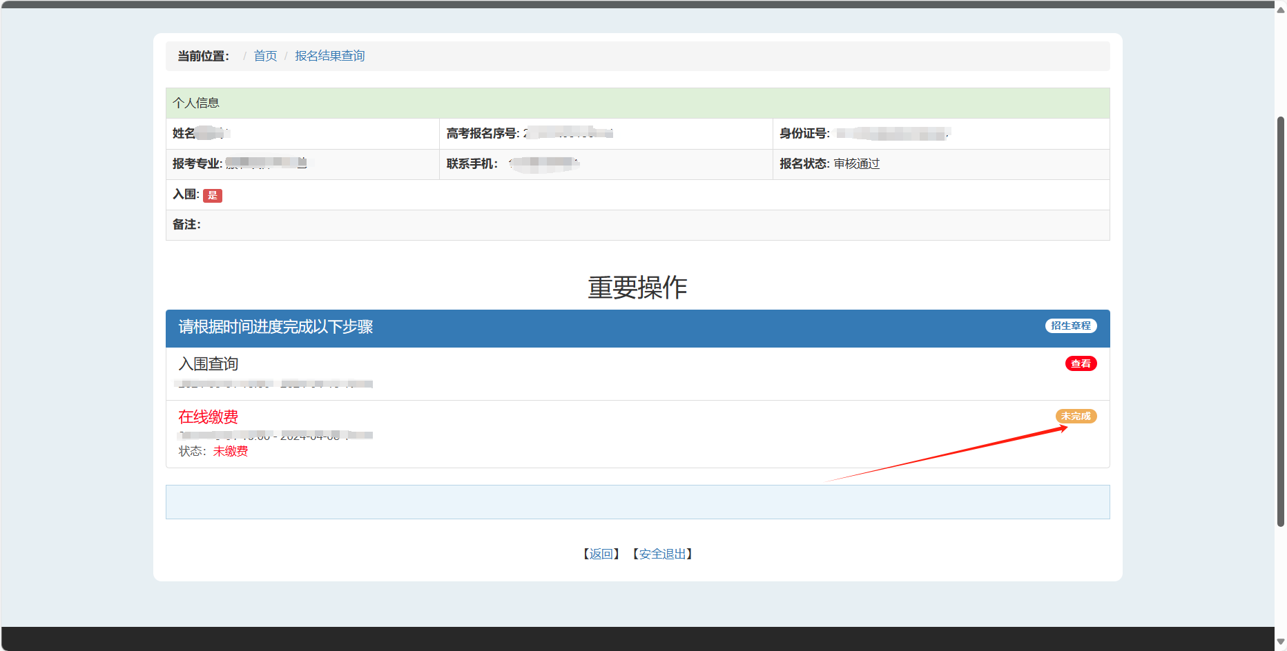 4月1日16:00后,考生可登录我校招生网,自行查询入围情况,并于4月1日16:00—4月8日16:00,进入系统完成报名考试费的缴纳。未按时缴费的考生视为自动放弃,请考生及时缴费。
