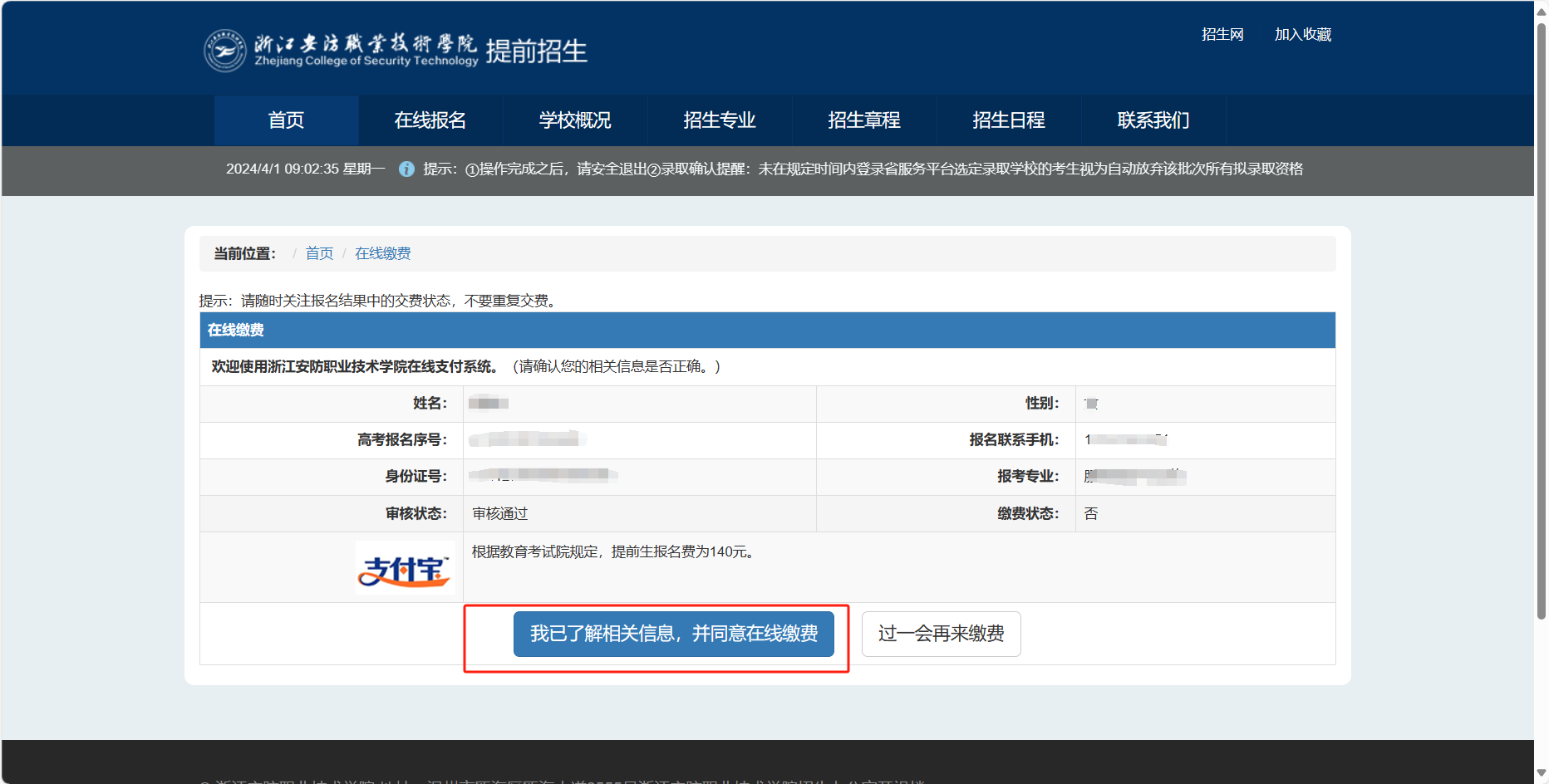 注:仅支持支付宝缴费