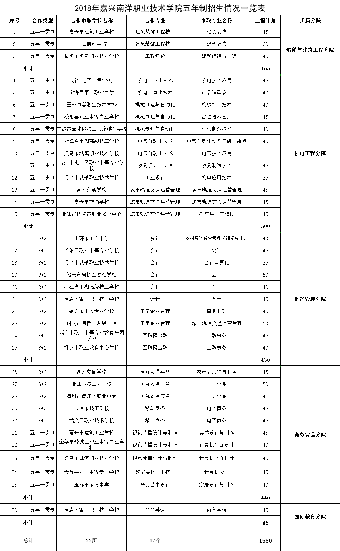 2018年嘉兴南洋职业技术学院五年制合作情况一览表