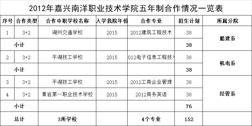 2012年嘉兴南洋职业技术学院五年制合作情况一览表