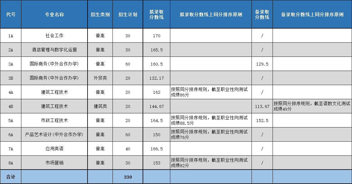 备注:当考生总分相同时,普高招生考生按校考综合素质测试成绩、学考折算成绩、学考单项成绩进行排序录取,学考单项成绩排列顺序:语文、数学、外语、思想政治、技术、历史、化学、地理、生物学、物理。若依然相同的,普通高中综合素质评价等级高的考生优先;单独考试招生考生按校考综合素质测试成绩、职业技能考试成绩排序录取。高中阶段具备相关选修课程学分或相关选修课程成绩优良的,在同等条件下优先录取。