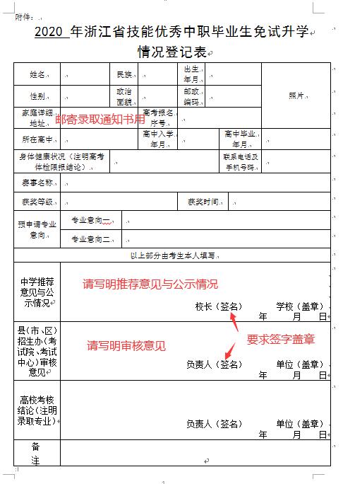 (1)经中学及当地招生办(考试院、考试中心)审核并盖章的《浙江省技能优秀中职毕业生免试升学情况登记表》;