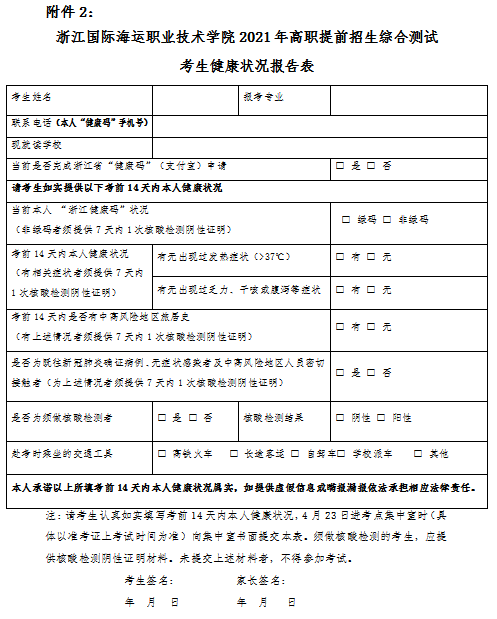 1、同学们需提前申领浙江省健康码,并填写《考生健康状况报告表》(纸质稿)(见附表2)。