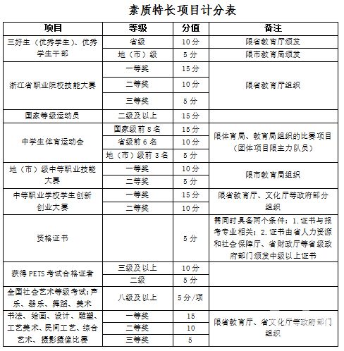 (五)素质特长计分办法考生凡在高中阶段符合素质特长计分办法所列条件的,若符合多项计分条件的,同类项计分只取高分项;不同类项可累计计分,但累计分值最高不超过20分。凡是符合素质特长分条件的考生,现场确认时必须提交计分证明资料。具体计分方法见下表。