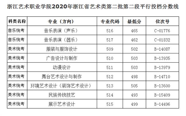 浙江艺术职业学院2020年浙江省艺术类第二批第二段平行投档分数线