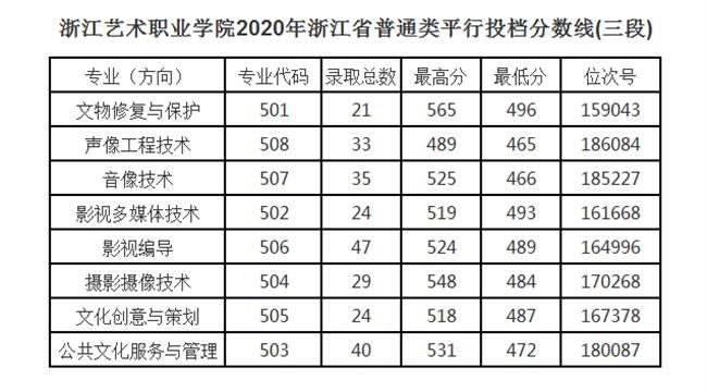 浙江艺术职业学院2020年浙江省普通类平行投档分数线(三段)