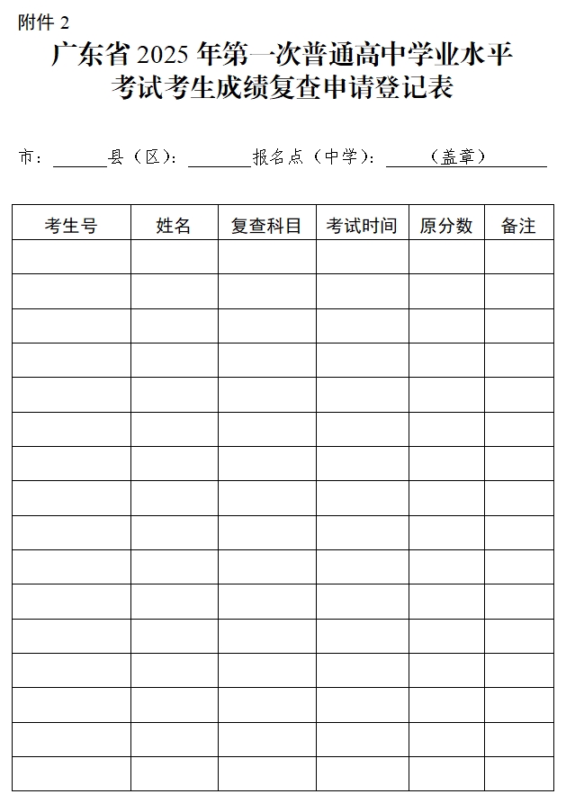 2.广东省2025年第一次普通高中学业水平考试考生成绩复查申请登记表