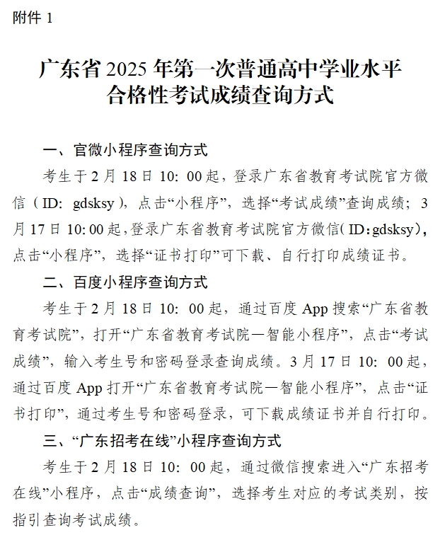 我院将于2025年2月18日10:00起发布2025年第一次高中学考成绩,考生可通过广东省教育考试院官微(ID:gdsksy)小程序、百度智能小程序或通过“广东招考在线”小程序查询成绩。3月17日10:00起,考生可以通过省教育考试院官微小程序、百度智能小程序自行下载并打印2025年第一次高中学考成绩证书。学考成绩公布和复查方式见附件1。