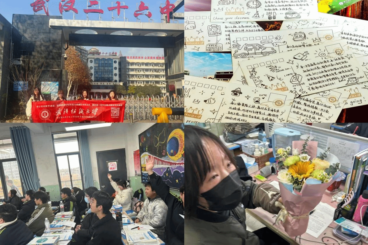 在武汉市第二十六中学,小韩同学和团队成员给恩师送去了鲜花,除了用PPT进行详细宣讲外,更是设置了包括问卷发放、签名纪念、知识竞赛、相互问答等环节,加深了同学们对武汉纺织大学印象。