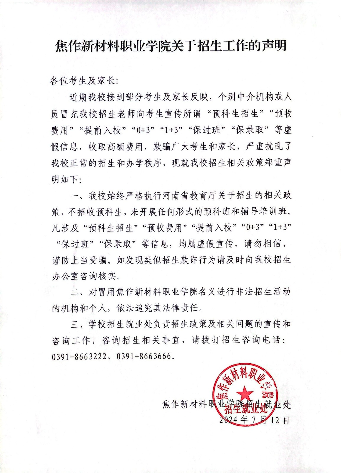焦作新材料职业学院关于招生工作的声明