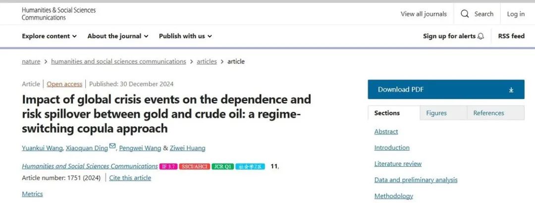近日,我校通识中心教师王元魁以第一作者在Humanities and Social Science Communications发表题为“Impact of global crisis events on the dependence and risk spillover between gold and crude oil:a regime-switching copula approach”的论文,讨论了全球危机事件对黄金和原油之间依赖结构以及风险溢出的影响。