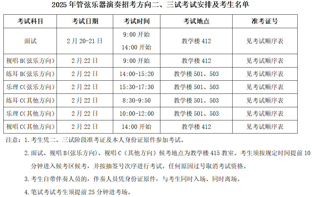 音乐表演(管弦乐器演奏)面试02月20日上午412教室 音乐表演(管弦乐器演奏)面试02月20日下午412教室 音乐表演(管弦乐器演奏)面试02月21日上午412教室 音乐表演(管弦乐器演奏)面试02月21日下午412教室 音乐表演(管弦乐器演奏)视唱B02月22日上午412教室 音乐表演(管弦乐器演奏)练耳B、乐理C02月22日下午501教室 音乐表演(管弦乐器演奏)练耳B、乐理C02月22日下午503教室 音乐表演(管弦乐器演奏)视唱C02月22日下午412教室 音乐表演(管弦乐器演奏)练耳C、乐理C02月22日上午501教室 音乐表演(管弦乐器演奏)练耳C、乐理C02月22日上午503教室
