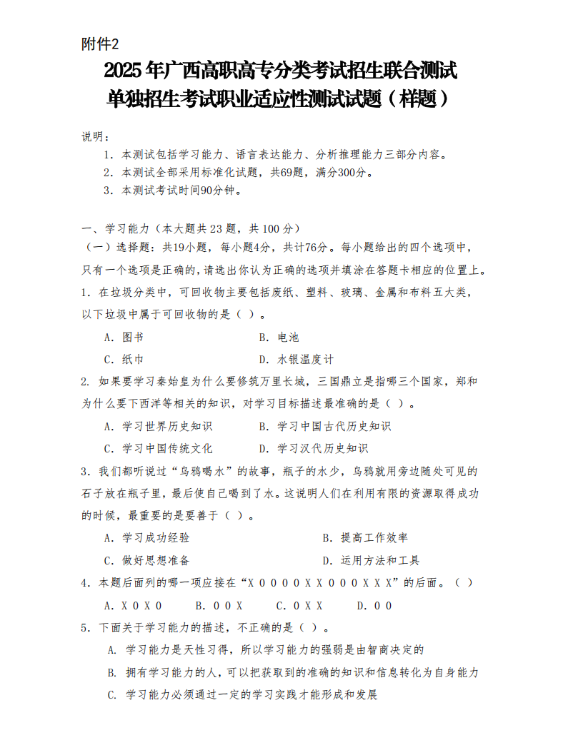下一篇:广西2025年高职高专分类考试招生联合测试单独招生《职业适应性测试》考试大纲