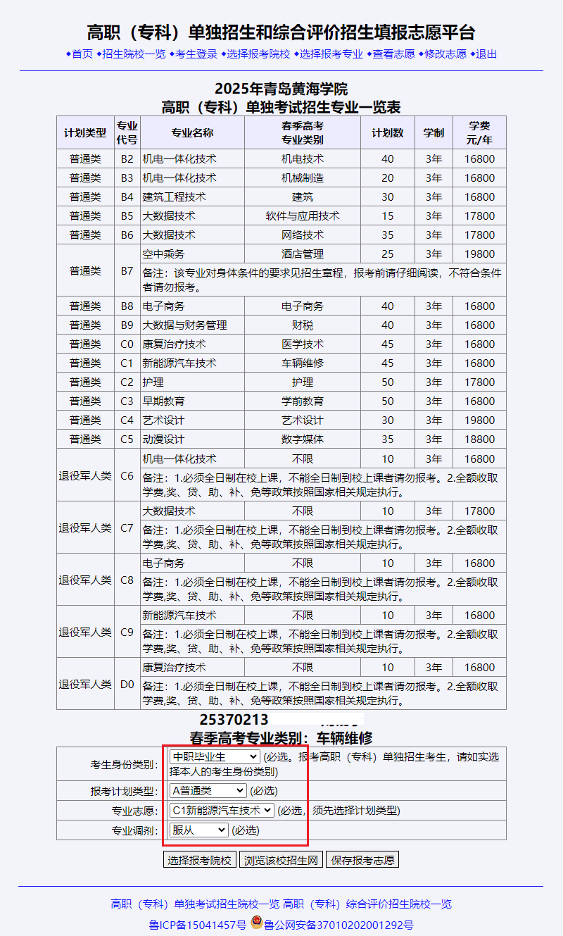 (二)参加我校专科单独考试招生和综合评价招生的考生须于2025年2月18日—2月21日(每天9:00至18:00)登录省教育招生考试院招生平台(网址:https://wsbm.sdzk.cn/gzdz)选报“青岛黄海学院”和专业。其中,参加单独考试招生的考生须根据春季高考报考的专业类别选报专业,选报专业对应的专业类别应与本人春季高考报考的专业类别一致。退役军人考生报考不受春季高考专业类别限制,通过单招被录取的退役军人考生必须全日制在校上课,不能全日制到校上课者请勿报考。每名考生可填报1个专业及专业是否服从调剂志愿。报名参加我校2025年专科单独考试招生或综合评价招生的考生不能兼报其他学校。