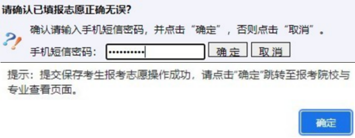 (六)报考志愿确认,在报考专业选择页面,系统提示保存志愿成功后点击“确定”进入报考志愿查看及确认页面。如下图: