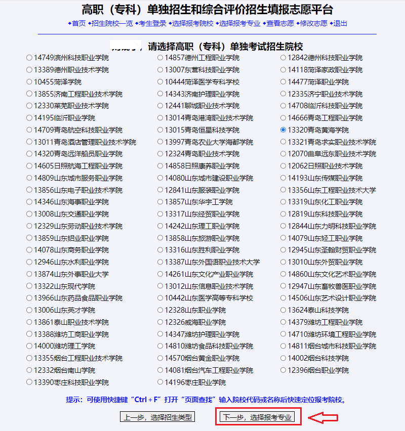 (四)考生选择报考招生类型后,选择报考院校,选择报考“13320青岛黄海学院”,如下图: