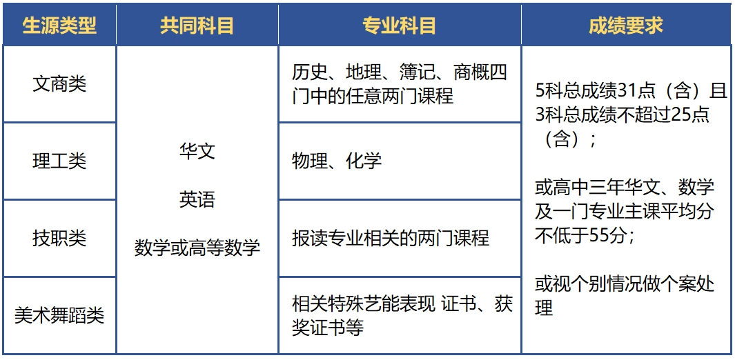 具有完整的高中(包括华文独中、国民中学、国民型中学)或同等学历,品学兼优、身体健康,遵守中国法律法规和武汉工商学院规章制度,年龄不超过24岁(2000年12月31日后出生)的马来西亚公民,可申请报读我校。