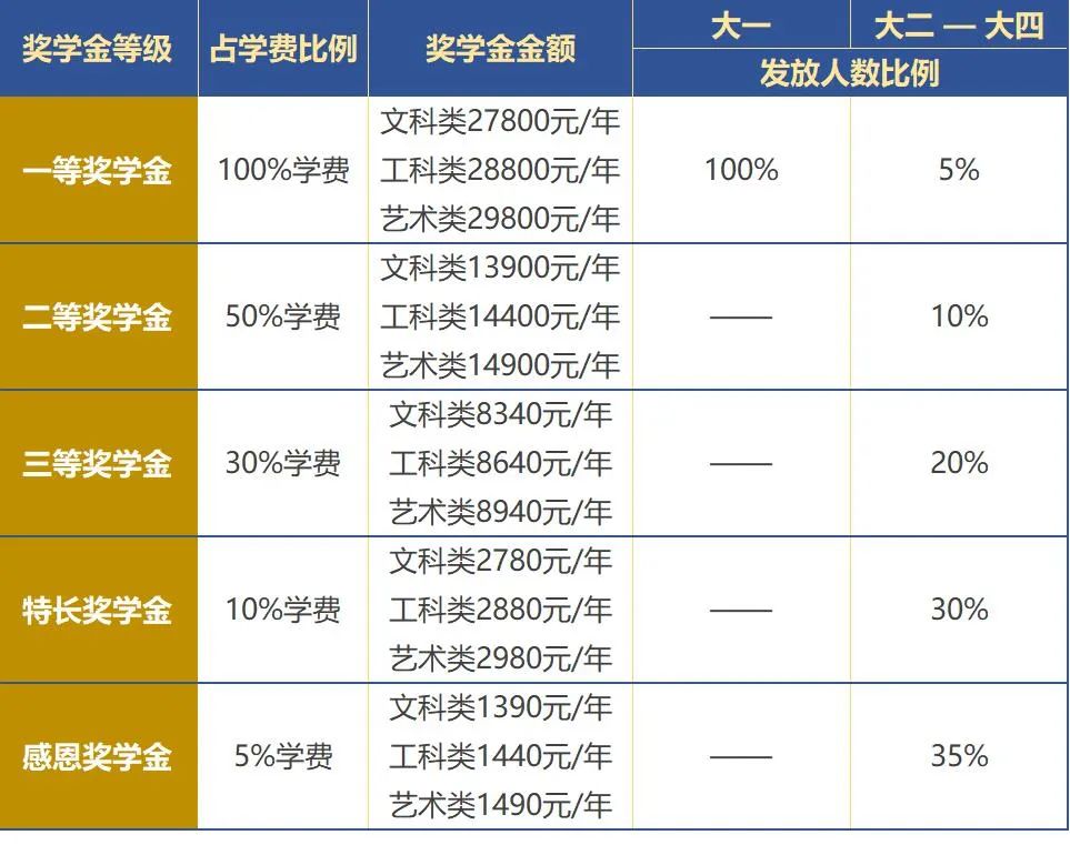 学校为马来西亚本科留学生设置奖学金,分为一、二、三等奖学金,特长奖学金,以及感恩奖学金。一等奖学金为学费金额的100%,二等奖学金为学费金额的50%,三等奖学金为学费金额的30%,特长奖学金为学费金额的10%,感恩奖学金为学费金额的5%。学校将为2025年录取的马来西亚留学生在大一学年全部发放一等奖学金;自大学二年级起,奖学金每学年评选调整一次,根据留学生前一学年学业及综合表现进行奖学金评选后发放。