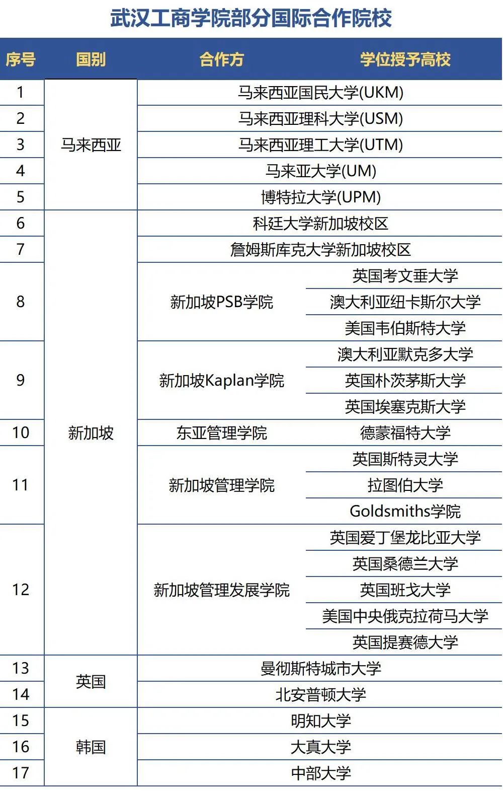 学校同时为全体留学生提供海外院校本科双学位及本升硕校际交流机会。选择中英校际交流项目及海外院校交流项目求学的留学生,有机会同时获得武汉工商学院本科学历学位,新加坡合作院校高级大专文凭(Advanced diploma)和海外合作院校学位。