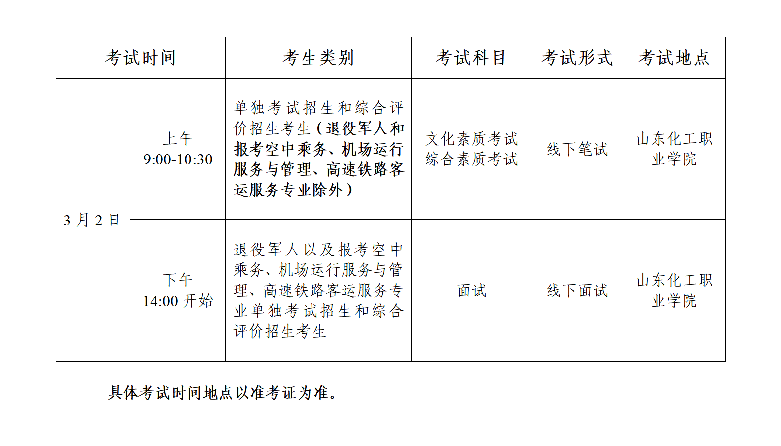 山东化工职业学院2025年单独考试招生和综合评价招生考试时间安排