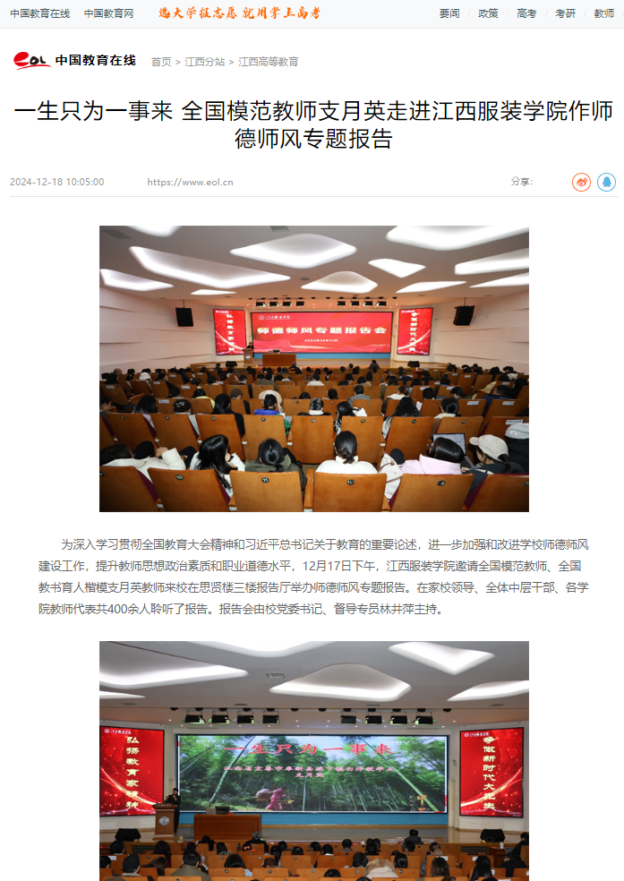 为深入学习贯彻全国教育大会精神和习近平总书记关于教育的重要论述,进一步加强和改进学校师德师风建设工作,提升教师思想政治素质和职业道德水平,12月17日下午,江西服装学院邀请全国模范教师、全国教书育人楷模支月英教师来校在思贤楼三楼报告厅举办师德师风专题报告。在家校领导、全体中层干部、各学院教师代表共400余人聆听了报告。报告会由校党委书记、督导专员林井萍主持。