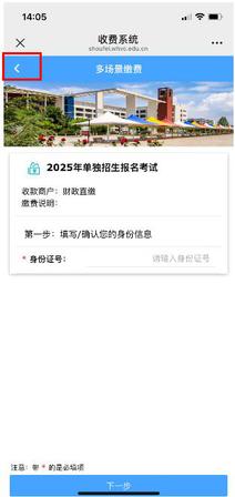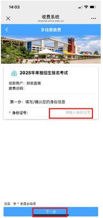 二、进入“威海职业学院收费系统2025年单独招生报名考试”界面,在“身份证号”一栏输入考生居民身份证号码后,点击“下一步”。