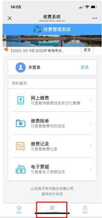 六、缴费完成后,重新使用微信扫码进入收费管理系统,按照下图操作进行缴费记录查询,因电子票据开具会有时间差,已缴费的考生可于缴费第二天(示例:2月22日缴费成功的考生,可于2月23日查询,最好间隔24小时后),登录“收费系统”,查看对应电子票据。