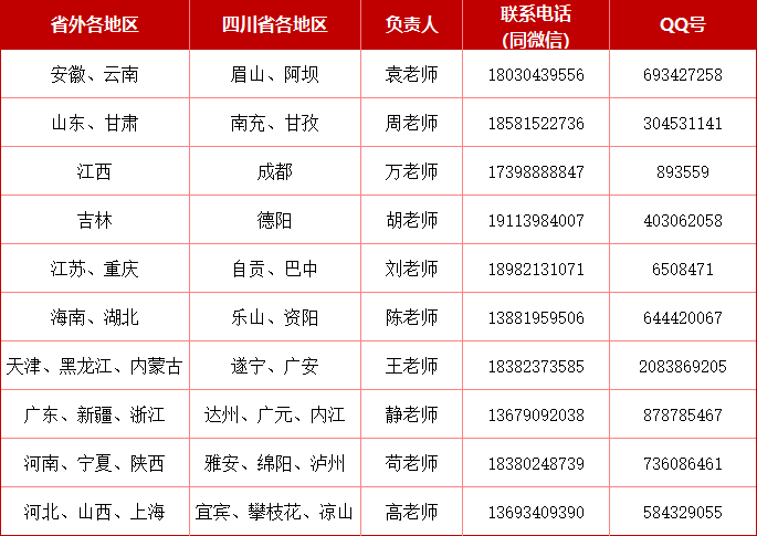 各地区招生负责老师联系方式
