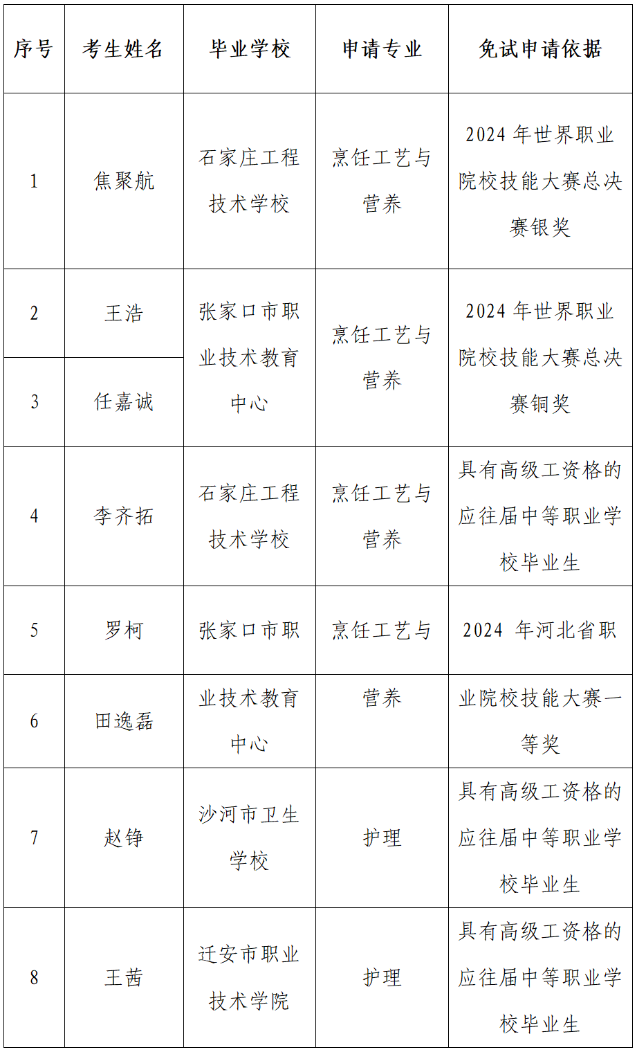 依据《2025年河北省普通高等职业教育单独考试招生工作实施办法》(冀教考院[2024]129号)的通知要求,现就申请我院高职单招技能拔尖人才免试录取通过名单予以公示,公示期10天,公示期过后报河北省教育考试院准。公示电话:0311-87251616。
