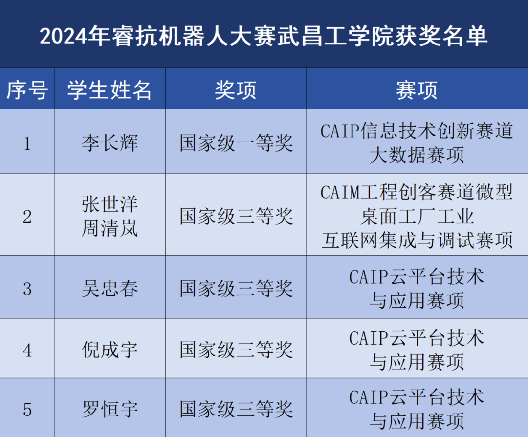 本次大赛包含CAIP信息技术创新赛道大数据、CAIM工程创客赛道微型桌面工厂工业互联网集成与调试和CAIP云平台技术与应用三个赛项,来自全国各地的优秀选手齐聚一堂,充分展现了其在信息技术领域的专业技能。决赛现场,我校选手沉着冷静,以出色的临场表现和创新的算法赢得了评委们的一致好评,体现了我校学子面对实际问题敏锐的洞察力和解决能力。最终,李长辉同学成功击败众多竞争对手,摘得此次比赛的最高奖项,张世洋、周清岚、吴忠春、倪成宇、罗恒宇等五位同学获得三等奖。