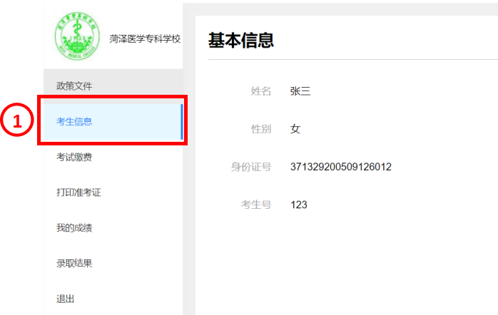 2.考生通过身份证号和考生号登录系统后,点击页面左侧“考生信息”栏目,核实考生信息。