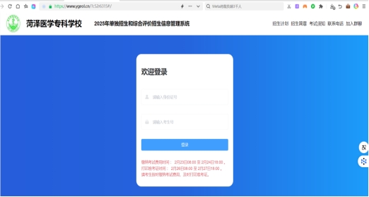 1.考生电脑登录我校官网首页(https://www.hzmc.edu.cn/)或招生信息网首页(https://www.hzmc.edu.cn/zsb/),通过首页上的缴费入口,点击进入我校2025年单招和综招信息管理系统,如下图。