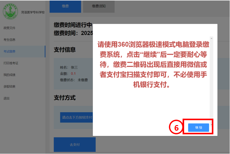 (2)点击“缴费”选项,找到下方“去支付”按钮并点击,弹出新窗口并点击右下角“继续”选项,弹出支付码支付页面,用微信或支付宝扫码支付即可。