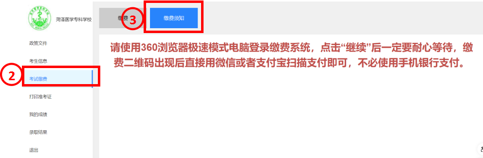 (2)考生只能用电脑打开网页,用微信或支付宝扫码缴费。