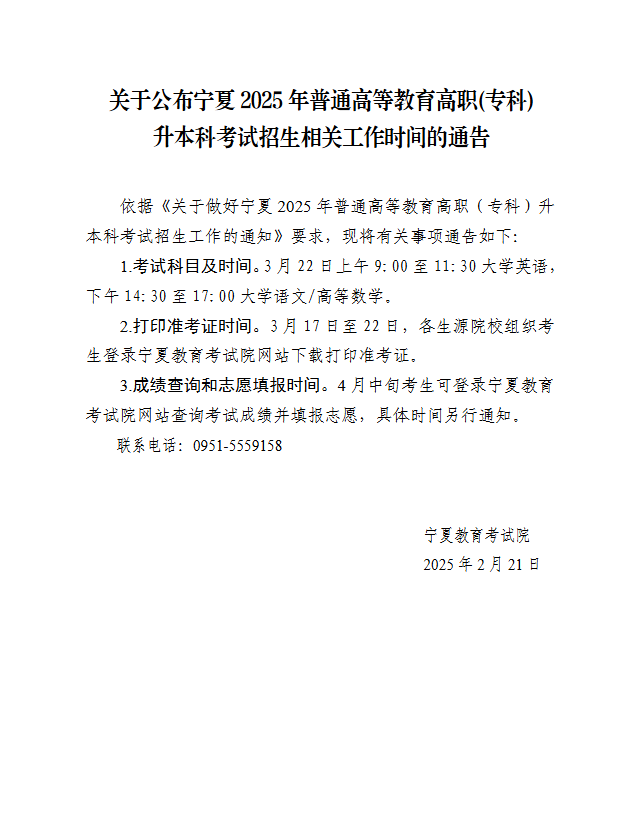 关于公布宁夏2025年普通高等教育高职(专科)升本科考试招生相关工作时间的通告