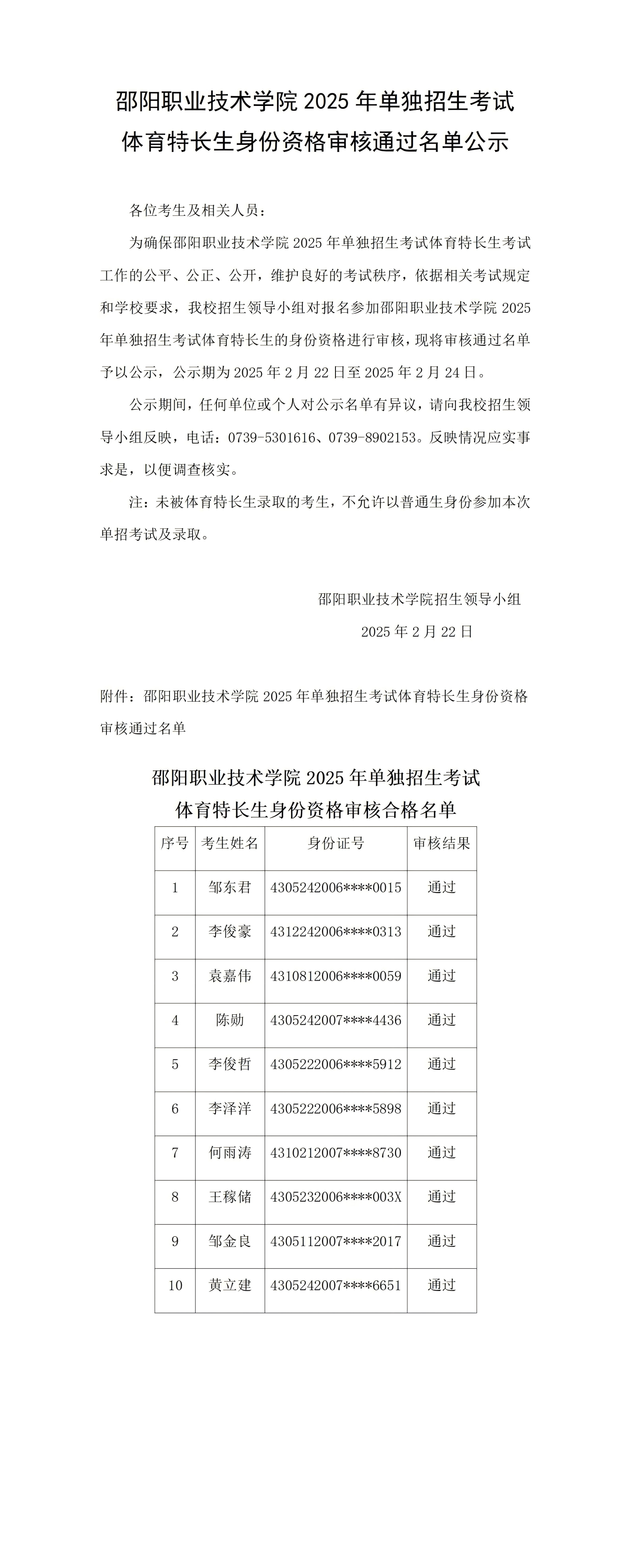 邵阳职业技术学院2025年单独招生考试体育特长生身份资格审核通过名单公示