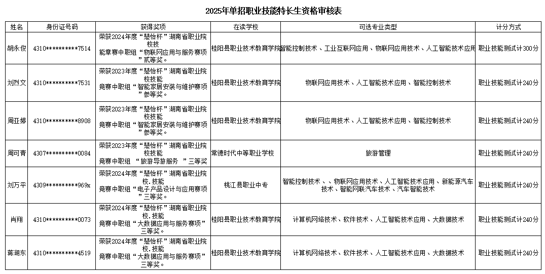 根据湖南省教育厅《关于做好我省2025年高职院校单独招生工作具体事项的通知》(湘教考通〔2025〕1号)文件要求,我校按文件要求对考生资格进行审查,现将审查结果进行公示,如有疑问,请联系学校招生就业工作处(0731-88105420)。