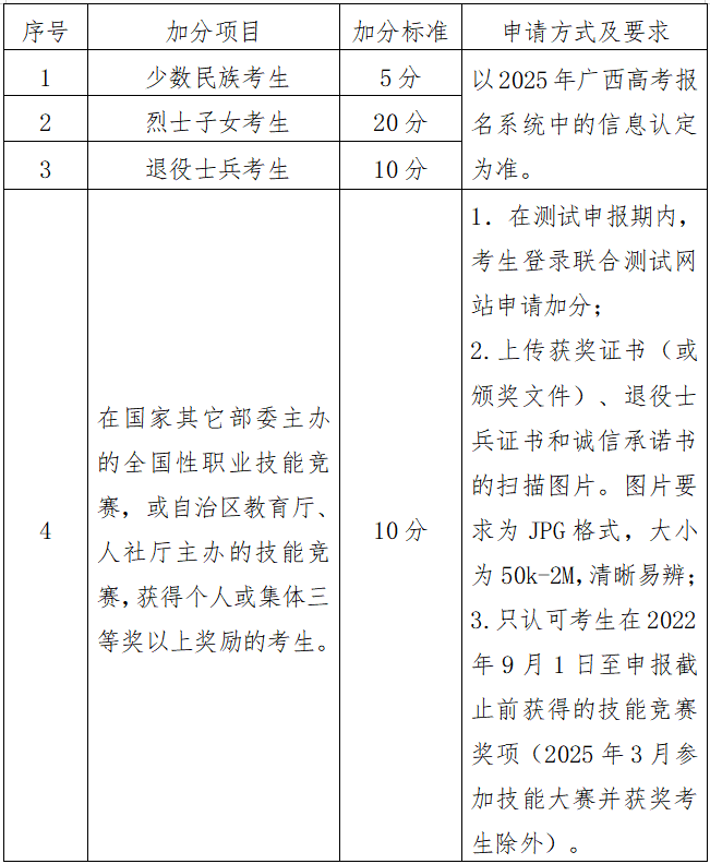 说明:①表中加分项目及加分标准仅适用于本次联盟院校的高职对口测试;②同一考生符合多项加分条件的,只按其中最高一项加分分值计入总成绩;③获得“对口免试生”资格的考生,按照上述加分项目的“第4点”加分分值计入总成绩。