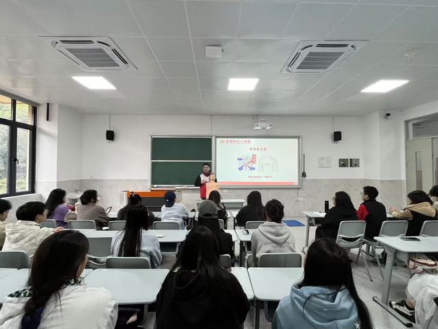 张健斌老师重点强调了心脏骤停的严重性和“黄金四分钟”概念的重要性,他主要从意识、呼吸、心跳等方面判断救助者是否需要心肺复苏,讲解了心脏骤停后如何紧急呼救、进行胸外按压、开放气道、人工呼吸等关键步骤,同时明确了按压速率(每分钟100-120次)、按压深度(至少5-6厘米)以及按压与人工呼吸比例(30:2)等要点。此外,还详细讲解了处理气道异物梗阻急救方法三步曲,即鼓励咳嗽、背部叩击法以及腹部冲击法。郑玲玲老师向同学们介绍了AED(自动体外除颤器)的构造及操作方法,并将心肺复苏配合AED的使用进行模拟操作演示。两位老师深入浅出的讲解方式,让应急救护不再是冷冰冰的技能,而是成为连接人心、守护生命的温暖桥梁。