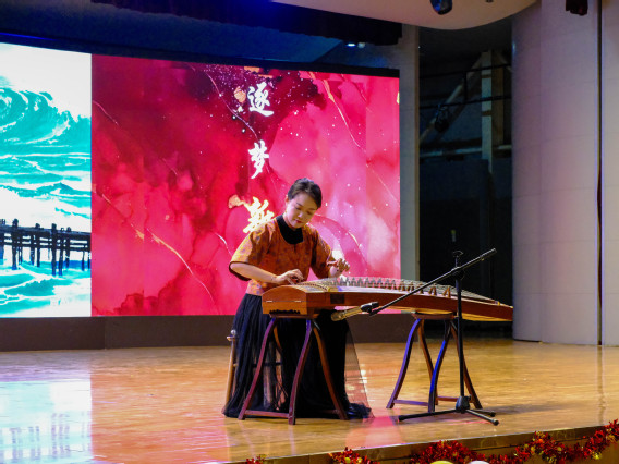此次晚会节目精彩纷呈,涵盖现代歌舞、古筝弹奏、歌曲演唱、舞台走秀、魔术表演,快板、小品等,充分展现了同学们的才艺与热情。首先开场的是由学院专任教师戴金陆带来的古筝弹奏《战台风》,充满热血的曲风和古筝弹奏瞬间点燃了全场的热情。