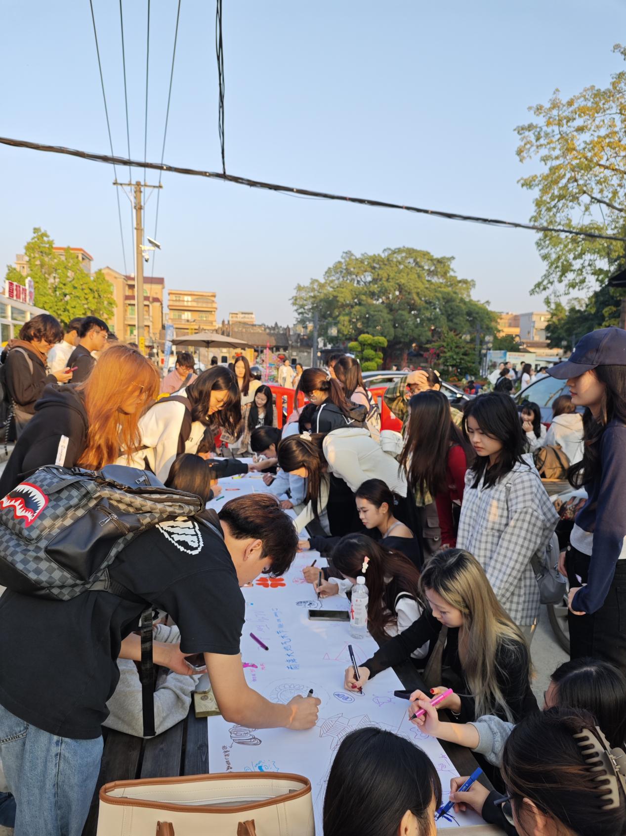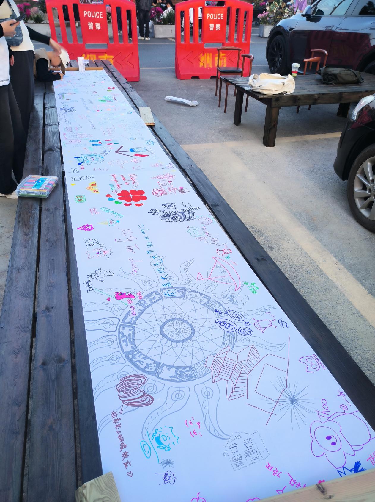 活动的尾声,全体学生共同绘制了一幅长达五米的画卷,将听音湖的宁静、儒溪村的古朴、烟南村的活力,以及活动中的欢笑与收获,都凝聚在了这幅充满创意与情感的画作中。这不仅是对本次实践教学活动的总结,更是学生们对节事活动与文化艺术融合发展美好愿景的生动表达。
