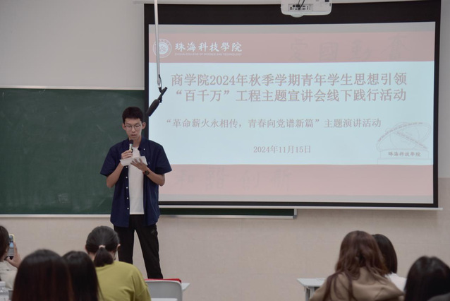 为深入贯彻爱国主义教育,大力弘扬革命传统精神,激励广大青年在新时代坚守初心、勇担使命。商学院于11月15日在格物楼k212举行了以“革命薪火永相传,青春向党谱新篇”为主题的演讲活动。本次活动由周婕老师主持。活动伊始,同学们依次进行关于革命故事的演讲,他们富有感染力的语言,让观众们仿佛置身于那段波澜壮阔的革命岁月,深刻感受到了革命先辈们的坚定信念。通过本次演讲活动,唤起同学们对革命先辈奋斗历程、牺牲奉献的深刻追忆,也凝聚青年力量。希望在党的引领下,同学们能够发挥青春效能,助力中华民族伟大复兴进程。