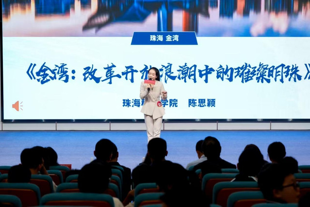 陈思颖围绕金湾各行各业在改革开放进程中的先进典型案例,创作题为《金湾:改革开放浪潮中的璀璨明珠》的演讲稿。聚焦航空航天产业、生物医药行业、智能制造产业,结合第十五届中国国际航空航天博览会的顺利举办,选取瑞康制药成功研发出针对罕见遗传性疾病的药物、“星耀科技”自主研发智能中控系统等典型案例,展现了金湾人民勇于创新、敢于奋斗精神风貌,描绘出未来金湾继续搭乘改革的快车奋勇疾驰的拼搏姿态。