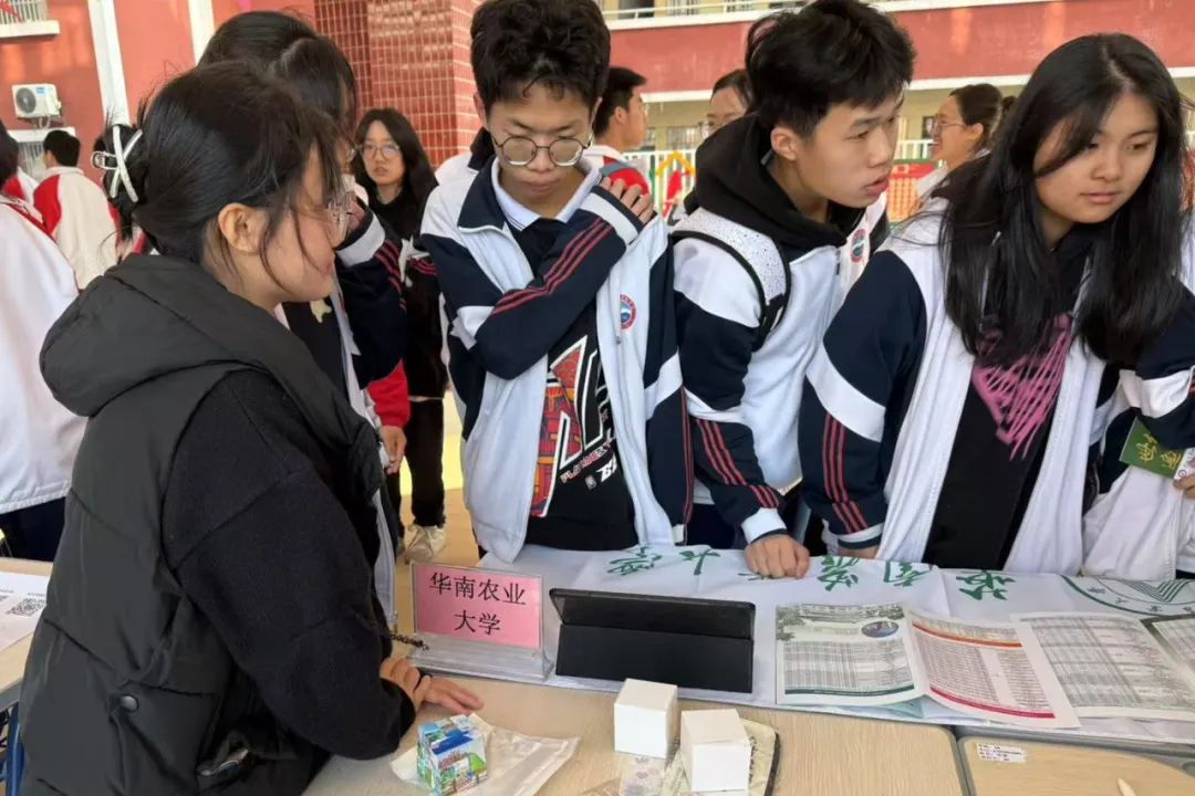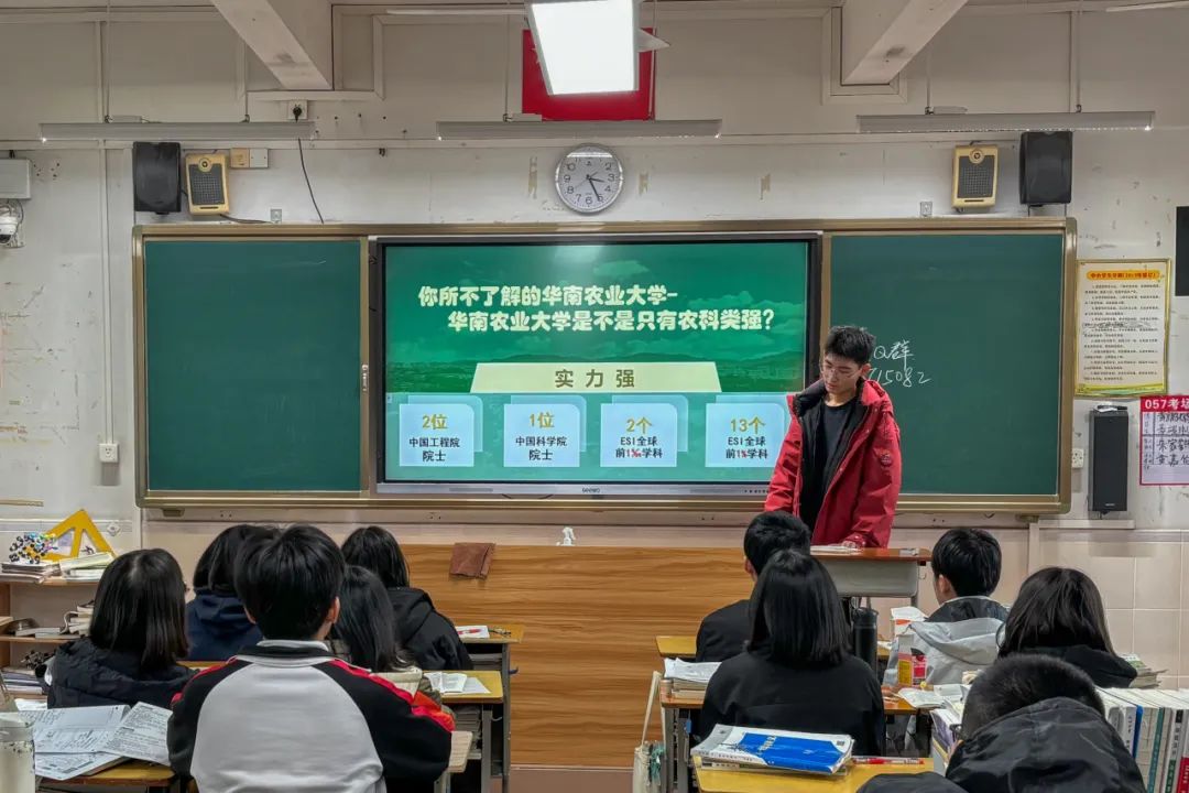 他们通过摆摊宣讲、寒招大讲堂和进班宣讲等多种形式,向学弟学妹们介绍了华南农业大学的师资力量、特色专业、校园环境以及丰富的课外活动。团队成员还结合自身经历,生动分享了大学生活的点滴、启发学弟学妹们对未来职业规划的思考,为高考备考及志愿填报提供参考。