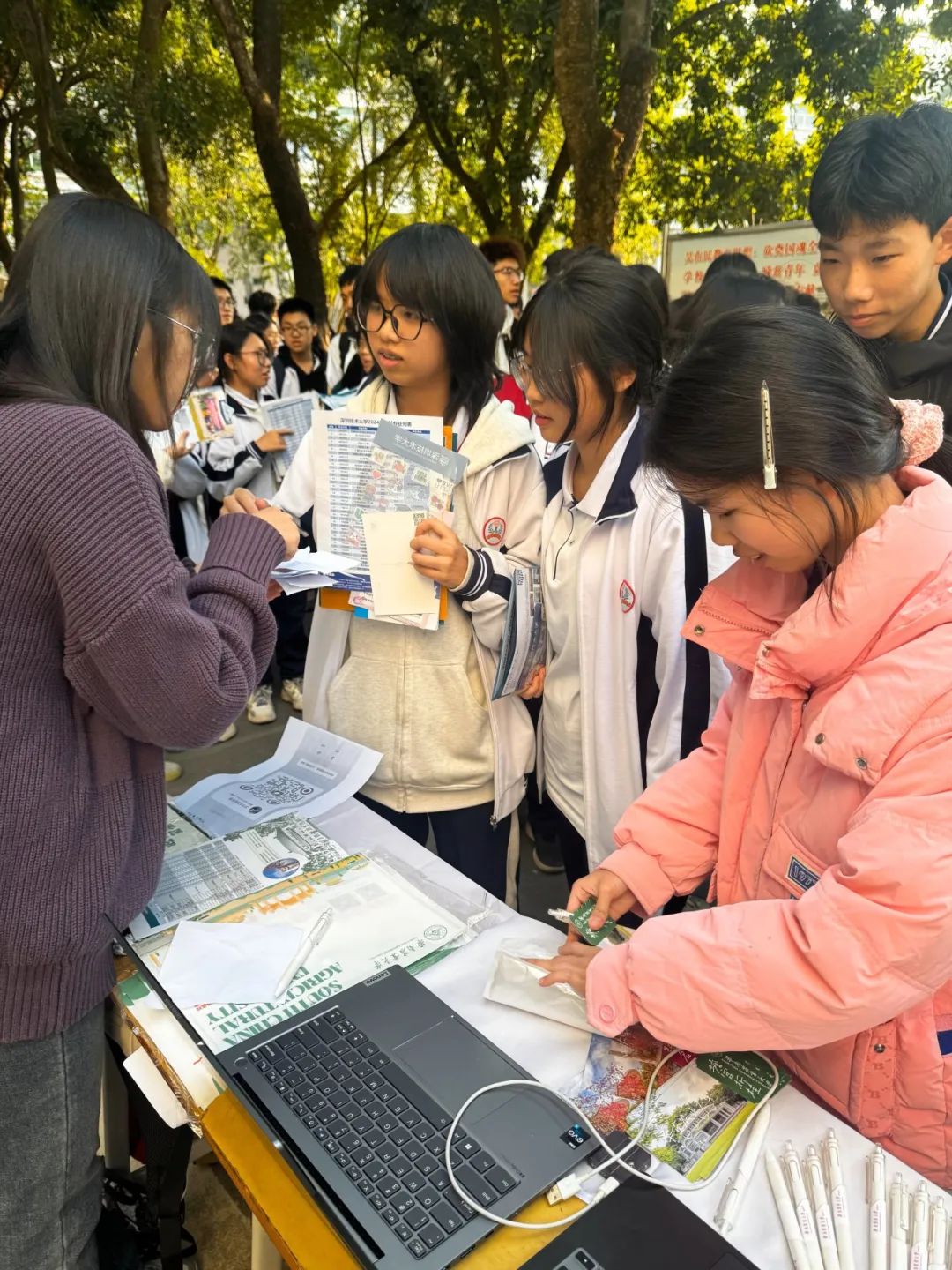 宣讲中,他们向高三学弟学妹们介绍了华南农业大学的特色课程、学科优势以及丰富多彩的校园生活,并结合个人经历分享了大学生活的点滴。团队还向咨询的同学赠送了钥匙扣、笔、书签等物资,帮助学弟学妹们更好地了解我校。