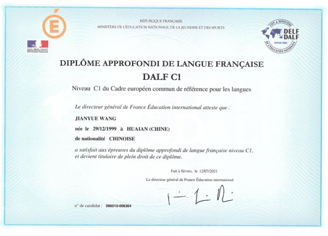 获得法语Dalf C1证书,广东省博物馆外语组金牌志愿者荣誉称号