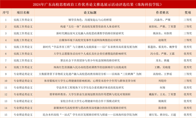 广东高校思想政治工作优秀论文推选展示活动评选结果(珠海科技学院)