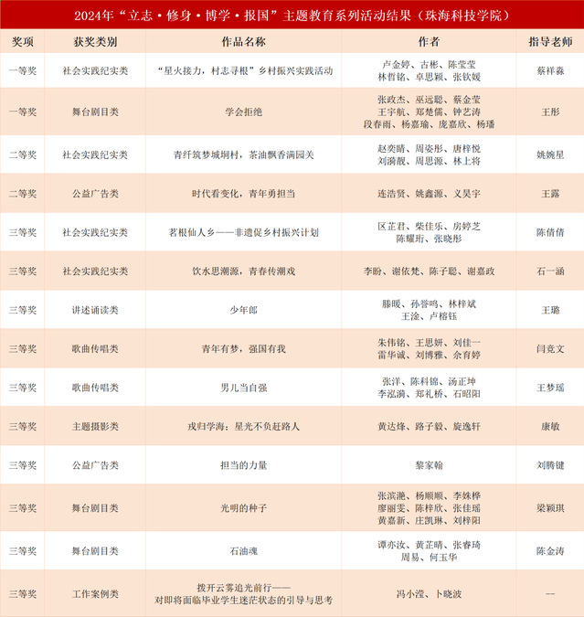 近日,经广东省教育厅公布,我校在2024年“立志·修身·博学·报国”主题教育系列活动中共获奖14项,创历史新高。其中一等奖2项、二等奖2项、三等奖10项。