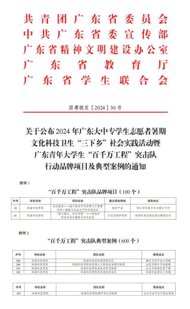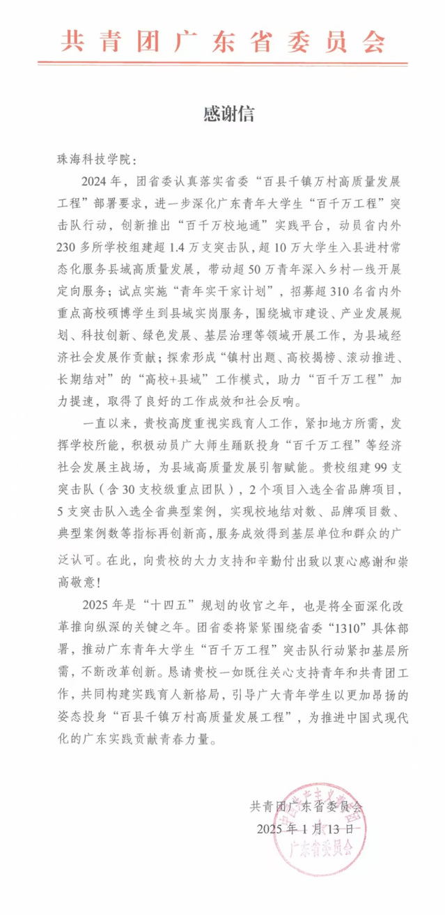 2024年,珠海科技学院认真落实省委“百县千镇万村高质量发展工程”部署要求,进一步深化广东青年大学生“百千万工程”突击队行动,立足珠海、服务广东,以社会需求为导向,深入推动突击队行动的有效落地,收到团省委向学校发来的感谢信。
